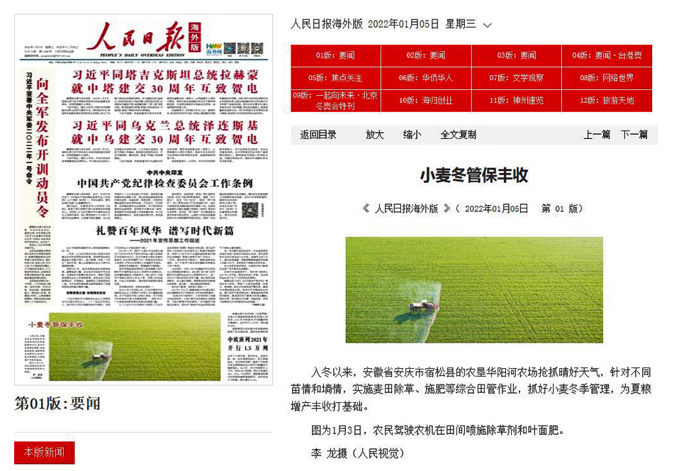 《人民日報》(海外版)等多家報紙重要版面報道華陽河冬季田管新聞